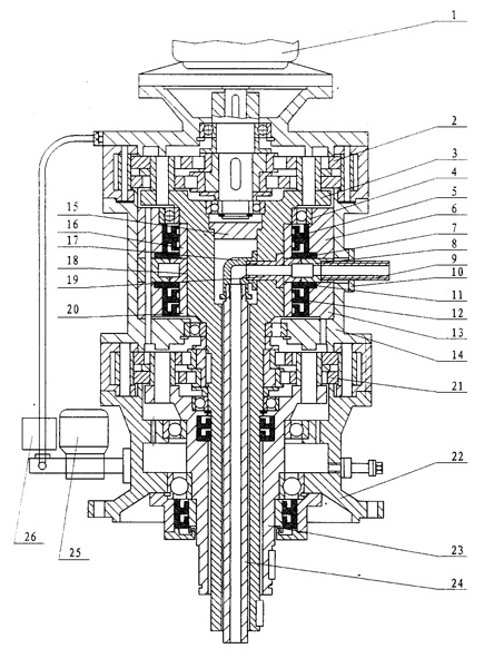 一種雙出軸噴液擺線減速機,包括有輸出軸(23)、中間輸出軸(3)、擺線輪(2)和(21)以及中間法蘭(14),其特征在于中間法蘭(14)中設(shè)有輸入接管(9),該輸入接管(9)與液體管外套(8)聯(lián)結(jié),所述輸入接管(9)通過管接頭(19)橫向進入中空的中間輸出軸(3)內(nèi),所述中間輸出軸(3)與管彎頭(17)聯(lián)接后再與液體輸出管(24)接通。