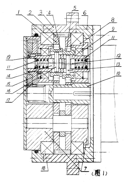 | 一種屬于曲柄擺線減速機(jī)或擺線減速機(jī)結(jié)構(gòu)形式的工業(yè)機(jī)器人微回差減速機(jī),其特征在于: (a)輸入軸[19]內(nèi)有一通孔; (b)輸入軸[19]裝配偏心軸承[4]、[5]部位上分別加工出同旋向的二螺旋槽,每一處螺旋槽系旋轉(zhuǎn)180°對稱、同旋向二短槽,兩槽旋轉(zhuǎn)貫通,槽指向偏心軸承內(nèi)孔鍵槽; (c)輸入軸[19]內(nèi)孔有對應(yīng)于螺旋槽的二只拉桿[14]與[12],在桿的徑向分別裝配銷[16]與[13],銷的一端置于一側(cè)螺旋槽中,另一端伸出另一側(cè)螺旋槽而與偏心軸承內(nèi)孔鍵槽滑配,當(dāng)拉桿移動時(shí),拉桿隨其上的銷沿螺旋槽移動的同時(shí)并轉(zhuǎn)動,最終使二偏心軸承相對偏轉(zhuǎn)一小角; (d)拉桿[14]、[12]兩端分別有壓縮彈簧[11],彈簧初壓縮力使二偏心軸承相對偏轉(zhuǎn)一小角度而不再錯(cuò)開180°。 |