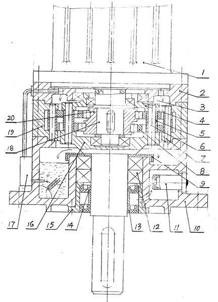 | 一種釜用不泄漏減速機,由擺線輪[8]、輸入軸[18]、偏心軸承[20]、機座[10]、針齒輪及W輸出機構組成,其中針齒輪由針齒殼[19],均布在針齒殼上的針齒[7]構成,W機構由輸出軸[16]與均布在輸出軸圓盤上的柱銷[6]及柱套[5]構成,其特征在于: a)機座[10]內(nèi)有一儲油腔,機座外壁有一油泵[17]用來將儲油腔的潤滑油泵至減速機頂端由上而下對機件進行潤滑; b)在輸出軸支承軸承[12]頂端有一圓環(huán)蓋[9],其高度高于儲油面1~3cm,用以防止從沿輸出軸漏油; c)在輸出軸軸承[12]下端有一個密封組件,它由套筒[15]及裝在套筒內(nèi)的密封[13]、[14]構成,二密封之間要有一定空間,密封組件用以防止有毒介質(zhì)從反應釜中泄漏到減速機內(nèi)腔。 |