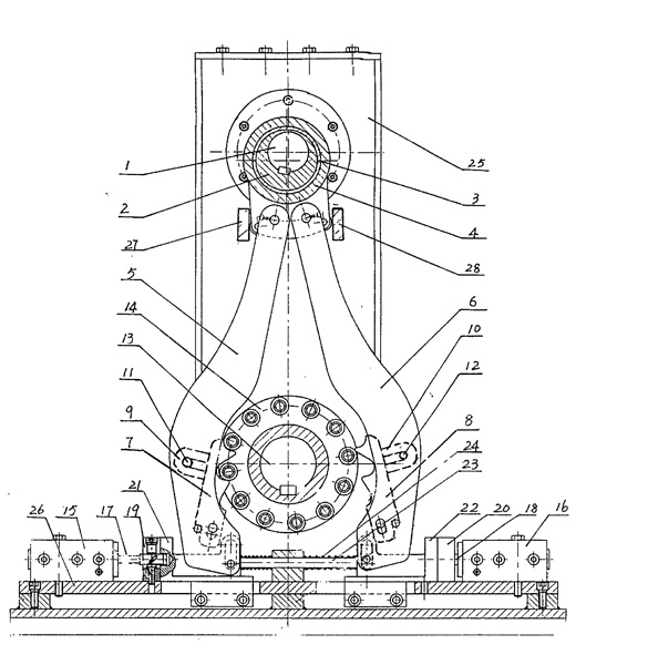 | 一種換向減速機(jī)包括殼體,換向裝置,主動(dòng)輪,被動(dòng)輪,輸出軸,輸入軸,其特征在上述所述的輸入軸(1)上固定偏心輪(2),偏心輪(2)外圓上有偏心軸承(3),偏心輪軸承(3)外圓上有拉板套(4),拉板套(4)上分別鉸連左拉板(5)、右拉板(6);左拉板(5)上鉸連左拉鉤(7),左拉鉤(7)上固定左拉鉤導(dǎo)塊(9);用左拉鉤導(dǎo)塊銷(11)與左拉板(5)鉸連;在右拉板(6)上鉸連右拉鉤(8),右拉鉤(8)上固定右拉鉤導(dǎo)塊(10)用右拉鉤導(dǎo)塊銷(12)與右拉板(6)鉸連,在輸出軸(13)上固定套筒滾子輪(14),在底板(26)上固定左程控液力缸(15)、右程控液力缸(16),左拉板導(dǎo)板(21),右拉板導(dǎo)板(22);在左程控液力缸(15)內(nèi)裝左柱塞(17),用左拉板鎖定器(19)與左拉板導(dǎo)板(21)連接,在右程控液力缸(16)內(nèi)裝有右柱塞(18),用右拉板鎖定器(20)與右拉板導(dǎo)板(22)連接,解鎖彈簧(24)套在推桿(23)上,拉板套(4)兩側(cè)設(shè)置有左限位板(27),右限位板(28)。 |