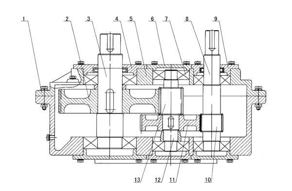 | 齒輪減速機,減速機設備領域。包括箱體和活動支撐在箱體上的主傳動軸、中間傳動軸以及被動傳動軸,箱體通過螺栓固定連接端蓋,主傳動軸上安裝一主齒輪,中間傳動軸上安裝一被齒輪和二主齒輪,被動傳動軸上安裝二被齒輪,一主齒輪與一被齒輪相嚙合,二主齒輪與二被齒輪相嚙合,其特征在于:一主齒輪(10)與一被齒輪(11)的模數為2,二主齒輪(13)與二被齒輪(2)為模數3.5的雙圓弧齒。與現有技術相比具有體積小、噪音低、傳動效率高,節(jié)約原材料和能源等優(yōu)點。 |