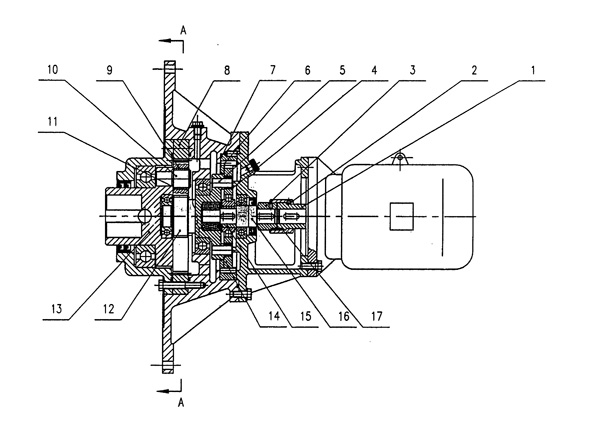 | 一種螺旋撈渣機(jī)專(zhuān)用減速機(jī),包括由電機(jī),以及安裝在機(jī)體內(nèi)的針齒殼(7),與針齒殼(7)套裝的針齒銷(xiāo)(6),輸入軸(16),與偏心軸承(15)套裝的擺線(xiàn)輪(14)、偏心軸承(15)以及銷(xiāo)套(4)、銷(xiāo)軸(5)所組成的擺線(xiàn)針齒內(nèi)嚙合行星傳動(dòng);其特征是:電機(jī)軸與輸入軸以及保險(xiǎn)裝置連為一體,在電機(jī)軸上裝有電機(jī)套(1),減速機(jī)輸入軸(16)上裝有輸入軸套(3),將剪斷銷(xiāo)(17)裝入電機(jī)套(1)和輸入軸套(3)上的鍵槽內(nèi),并用剪斷銷(xiāo)固定套(2)將剪斷銷(xiāo)(17)固定;NGW型行星傳動(dòng)結(jié)構(gòu)由內(nèi)齒圈(8),齒輪軸(12)和公用行星齒輪(9)以及輸出軸(13)組成,內(nèi)齒圈(8)用螺栓固定在機(jī)體上,齒輪軸(12)的上部用一個(gè)大軸承固定在機(jī)體上,下部用一個(gè)小軸承固定在輸出軸(13)上,銅套(11)壓入行星齒輪(9)的孔內(nèi),并套入行星齒輪軸(10)上;內(nèi)齒圈(8)與行星齒輪(9)相嚙合,行星齒輪(9)與齒輪軸(12)相嚙合;齒輪軸(12)是第一級(jí)傳動(dòng)的輸出軸,通過(guò)軸承與輸出軸(13)連為一體;齒輪軸(12)帶動(dòng)行星齒輪(9)轉(zhuǎn)動(dòng),內(nèi)齒圈(8)固定不動(dòng),三個(gè)行星齒輪軸(10)套裝在輸出軸(13)上,第一級(jí)的輸出軸即齒輪軸(12)轉(zhuǎn)動(dòng)時(shí),帶動(dòng)行星齒輪(9)轉(zhuǎn)動(dòng),由于行星齒輪(9)與內(nèi)齒圈(8)相嚙合,內(nèi)齒圈(8)固定不動(dòng),因此,行星齒輪(9)帶動(dòng)輸出軸(13)轉(zhuǎn)動(dòng)。 |