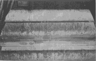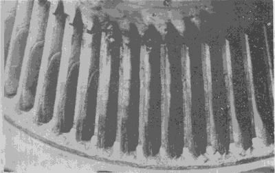 高速運轉齒輪齒面頂部的沖蝕,其部位與潤滑劑噴嘴的方向一致。