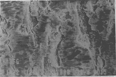 油膜相對于重載很薄的潤滑條件下運轉的齒輪副工作齒面的損傷。損傷面放大后可見密密麻麻成片的微小蝕微小裂紋。