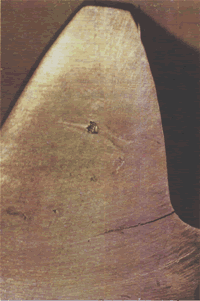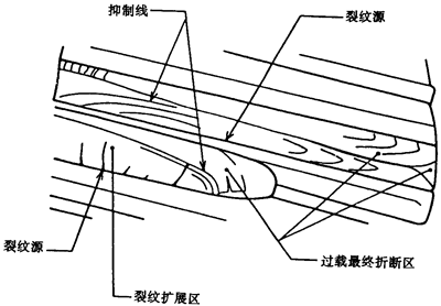 斷口面分為兩個不同的區(qū)域,疲勞斷口面和最終斷口面。在疲勞區(qū)內看不到塑性變形痕跡,斷口面平滑、無光澤,有時由于被抑制線分割,可顯現出裂紋擴展各連續(xù)階段的間隔區(qū)。
