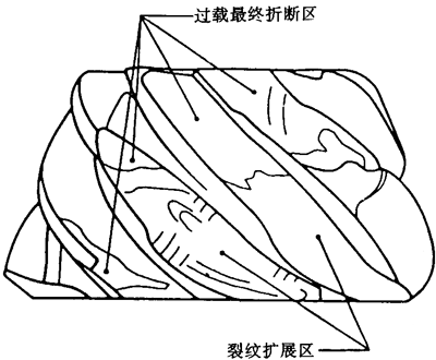 這類折斷通常只在一次或很少幾次嚴重過載時發(fā)生。有時,由于過載產生的初始裂紋會像疲勞裂紋一樣緩慢發(fā)展后而折斷,這種初始裂紋區(qū)域在裂紋發(fā)展中通常還存在有微動腐蝕的跡象。過載斷口面有三種類型: