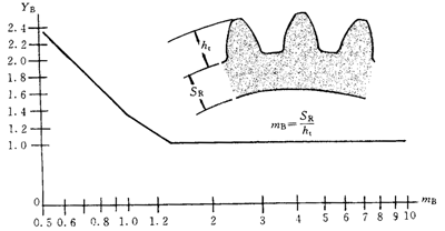 計算分析表明,當(dāng)齒輪的輪緣厚度SR相對地小于輪齒全齒高h(yuǎn)t時(SR及ht意義見C1),輪齒的齒根彎曲應(yīng)力將明顯增大。光彈實驗和有限元分析均指出:當(dāng)輪緣齒高比mB=SR/ht≥2.0時,mB對齒根彎曲應(yīng)力沒有影響。在mB=1.0~2.0區(qū)間,齒根彎曲應(yīng)力開始增大。圖C1是經(jīng)分析歸納得出輪緣系數(shù)YB與輪緣高比mB的關(guān)系曲線,它由以mB=1.0和1.56為折點的三段直線組成。