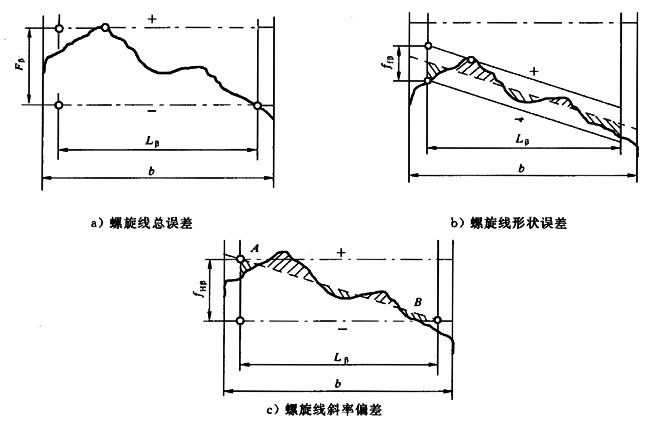 在被測圓柱面上,過評定范圍兩端交平均螺旋線A、B兩點(diǎn)的兩條理論螺旋線間的差值以fHβ表示(見圖6c)。