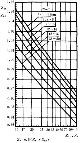 接觸弧長系數(shù)是考慮齒面接觸弧的有效工作長度對齒面接觸應(yīng)力影響的系數(shù)。當(dāng)齒數(shù)比不等于1時,一個齒輪的上齒面和下齒面的接觸弧長不一樣。接觸弧長系數(shù)應(yīng)取兩個齒輪的平均值,即Za=0.5(Za1+Za2),Za1和Za2值可按小齒輪和大齒輪的當(dāng)最齒數(shù) 和 查圖6。