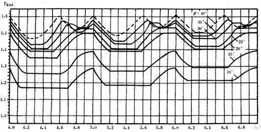 齒端系數(shù)是考慮接觸跡在齒輪端部時,端面以外沒有齒根來參與承擔(dān)彎曲力矩,以致端部齒根應(yīng)力增大的影響系數(shù)。對于未修端的齒輪,YEnd值可根據(jù)εβ(εβ=b/Px)由圖8查取(當(dāng)β不是圖中值時,用插值法查取)。