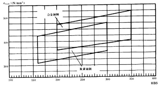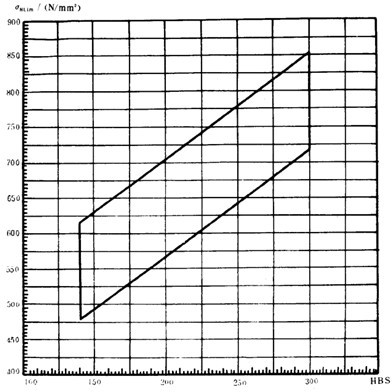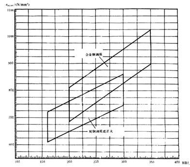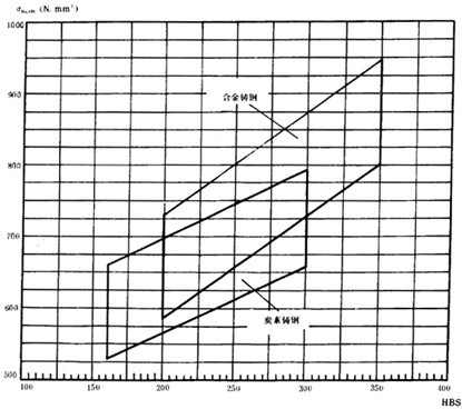 疲勞極限是指某種材料的齒輪經(jīng)長期持續(xù)的重復(fù)載荷(接觸應(yīng)力循環(huán)基數(shù)No=5×107,彎曲應(yīng)力循環(huán)基數(shù)No=3×106)作用后,輪齒保持不破壞時的極限應(yīng)力。它可由齒輪的負(fù)荷動轉(zhuǎn)試驗(yàn)或經(jīng)驗(yàn)統(tǒng)計(jì)數(shù)據(jù)獲得。當(dāng)缺乏資料時,可參考圖10和圖11,根據(jù)材料和齒面硬度取值。鑄鋼、氮化鋼和球墨鑄鐵的疲勞極限見附錄A(補(bǔ)充件)。