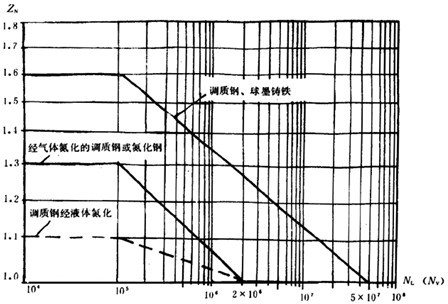 圖12當(dāng)調(diào)質(zhì)鋼和球墨鑄鐵的應(yīng)力循環(huán)次數(shù)NL或NV≥5×107時,ZN=1;氮化鋼的應(yīng)力循環(huán)次數(shù)NL或NV≥2×106時,ZN=1。圖13的應(yīng)力循環(huán)次數(shù)NL或NV≥3×106時,YN=1。