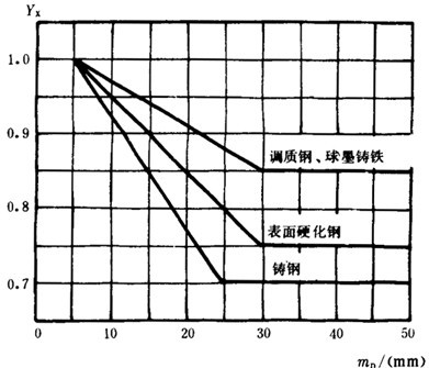 尺寸系數(shù)是考慮實(shí)際齒輪模數(shù)大于試驗(yàn)齒輪模數(shù)而使材料強(qiáng)度降低的尺寸效應(yīng)。其值可按圖16查取。