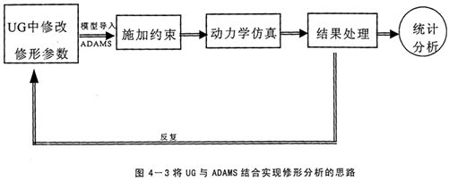 前面已經(jīng)以擺線傳輸線的參數(shù)化建模為例,闡述了UG的強(qiáng)大的基于特征的參數(shù)化造型功能,既然用子程序的方式實(shí)現(xiàn)不了,將UG的該功能加以充分利用,也可以實(shí)現(xiàn)優(yōu)化修形的目的。實(shí)現(xiàn)的途徑是在建造擺線輪的表達(dá)式中考慮修形量△Rz與△r,這樣就建造了修形后的擺線輪,同時(shí)△Rz與△r是隨機(jī)可調(diào)的變量,可以得到任意組合的修形方式。并且UG的數(shù)據(jù)存儲(chǔ)具有單一數(shù)據(jù)庫(kù)的特點(diǎn),零件圖中修改后,裝配圖及工程圖全都自動(dòng)更新,不用人工去費(fèi)時(shí)修改。然后,再將總裝配模型導(dǎo)入到ADAMS中施加約束。執(zhí)行仿真。這樣就得到多組修形組合的仿真結(jié)果,經(jīng)過(guò)統(tǒng)計(jì)分析就可得到最佳的修形組合。具體思路如下圖所示。