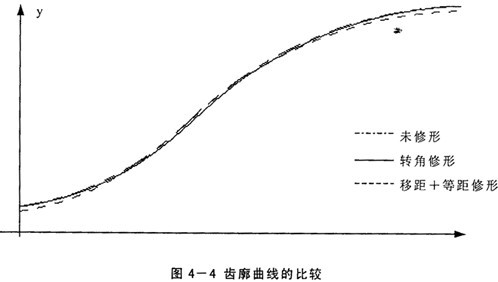 采用這種方法加工擺線輪時(shí),磨齒機(jī)的調(diào)整和加工標(biāo)準(zhǔn)齒廓時(shí)相同,只是在磨出標(biāo)準(zhǔn)齒廓以后,將分齒機(jī)構(gòu)和偏心機(jī)構(gòu)的聯(lián)系脫開(kāi),然后撥動(dòng)分齒掛輪上的齒輪,使工作臺(tái)轉(zhuǎn)過(guò)一微小的角度δ,從而改變了擺線輪在上一次磨削時(shí)的初始位置。這樣重新磨削后,就得到一條與標(biāo)準(zhǔn)齒廓基本上一樣的齒廓,僅整個(gè)輪齒變瘦一些,而齒間變大一些;其特點(diǎn)是同時(shí)嚙合齒數(shù)較多,但擺線輪的齒頂和齒根圓直徑?jīng)]有變化,該處與針齒相嚙合時(shí)沒(méi)有間隙存在,因此不能單獨(dú)使用轉(zhuǎn)角修形法。
