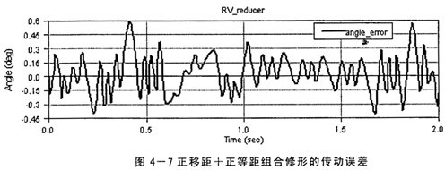其中,θer一一角度運(yùn)動(dòng)誤差,一一任意時(shí)刻輸入軸轉(zhuǎn)角,i一一傳動(dòng)比,θout一一輸出軸轉(zhuǎn)角。由于加工誤差、輪齒修形的原因引起瞬時(shí)傳動(dòng)比的變化,必然出現(xiàn)傳動(dòng)誤差,產(chǎn)生運(yùn)動(dòng)的不平穩(wěn)性。在RV減速器中,漸開(kāi)線齒輪嚙合在前級(jí),后級(jí)是擺線針輪傳動(dòng),由于后級(jí)的傳動(dòng)比一般約是前級(jí)的4~30倍,前級(jí)的漸開(kāi)線齒輪的傳動(dòng)誤差將被縮小同樣的倍數(shù)后輸出,所以其傳動(dòng)誤差關(guān)鍵取決于后級(jí)的擺線針輪的嚙合誤差,而實(shí)際工作中擺線輪的修形方式及修形量的選擇是影響擺線針輪的嚙合誤差很大的因素。因此本課題中僅研究了輪齒修形對(duì)傳動(dòng)誤差的影響,所采用的修形量以及得到的傳動(dòng)誤差大小如表4-1所示,限于篇幅,對(duì)于負(fù)移距+正等距、正移距+負(fù)等距和正移距+正等距組合修形的傳動(dòng)誤差仿真結(jié)果曲線各只列出一組(圖4-5、4-6、4-7)。