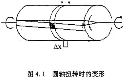 在圖4.1中,ф表示圓周兩端截面的相對轉角,稱為扭轉角。扭轉角用弧度來度量。用相鄰的橫截面p-p和q-q從軸中取出長為dx的微段。剪應變