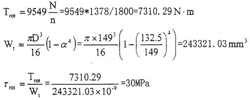 根據(jù)實際情況計算出工作時的剪應力:GK2型內燃機車啟動發(fā)電機ZQF-38TH,115V,38KW,1170~358Or/min;GK2型內燃機機用柴油機型號為MTU16V396TC14,持續(xù)功率為1378KW,旋轉角速度為18O0rod/min。柴油機冷區(qū)液溫度為40℃時最小啟動轉矩包括加速余量約8OON.m,曲軸扭矩約75ON.m