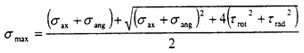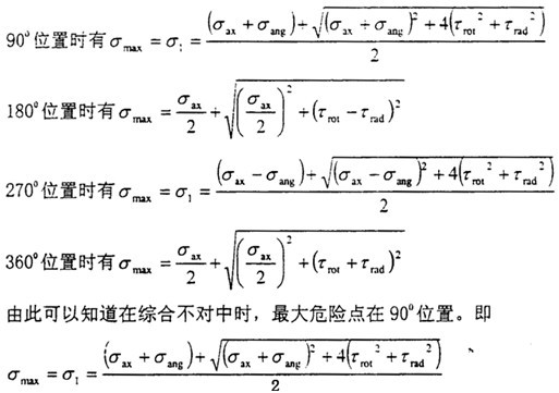 此時的應力情況屬于三向應力狀態(tài),所以其分析過程和徑向不對中900以及2700以情況相似,只是這里還有了附加的軸向拉應力和附加的角向應力,將各個應力值σxx=σax+σang,σyy=0,σzz=0,τxy=τrot,τyz=0,τzx=τrad分別代入式(4-29)(4-30)(4-31)中,可以得到