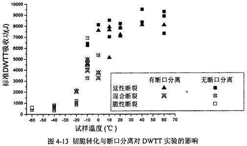 圖4-13比較了在延性和脆性斷裂中有無斷口分離試樣的DWTT韌性值。結(jié)論與CVN實(shí)驗(yàn)類似,發(fā)生斷口分離的試樣,測(cè)得韌性值略低。