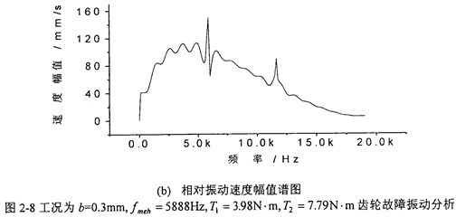 圖2-4(b)是輕載時(小的齒側(cè)間隙)齒輪輪齒相對振動速度幅值譜圖。從圖上可看出,此時振動故障頻率為齒輪嚙合頻率fmeh的1、2、3倍,無分?jǐn)?shù)諧波成份出現(xiàn)。