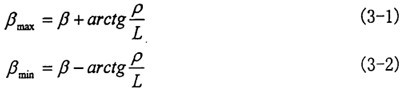 由于在轉(zhuǎn)動(dòng)的過(guò)程中,三叉桿交點(diǎn)作旋轉(zhuǎn)運(yùn)動(dòng),因此會(huì)導(dǎo)致輸入軸與輸出軸之間的夾角發(fā)生變化,其變化范圍為βmin~βmax,當(dāng)O點(diǎn)(見(jiàn)圖3-5)處于輸入軸與輸出軸轉(zhuǎn)動(dòng)錐中心線所構(gòu)成平面的兩個(gè)極限位置時(shí),偏轉(zhuǎn)角達(dá)到兩極值: