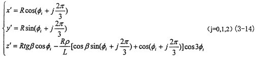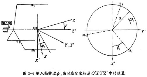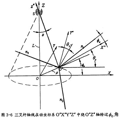 按圖3-5所示坐標(biāo)系,可先在動(dòng)坐標(biāo)系O″X″Y″Z″中建立三叉桿軸頸的軸線參數(shù)方程然后通過(guò)坐標(biāo)變換轉(zhuǎn)至固定坐標(biāo)系O′X′Y′Z′中,因輸入軸的滑道軸線同三叉桿軸頸的軸線相交(于小桿球面的中心),故在坐標(biāo)系O′X′Y′Z′中聯(lián)立三叉桿軸頸的軸線參數(shù)方程和輸入軸的滑道軸線參數(shù)方程,在這個(gè)聯(lián)立的方程中會(huì)出現(xiàn)兩個(gè)未知量即輸出轉(zhuǎn)角