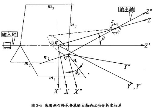 由于輸出軸作一圓錐運(yùn)動(dòng),在分析的過(guò)程中需建立三套坐標(biāo)系,如圖3-5所示。