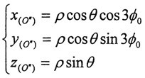 ≈o,cosθ≈1(實(shí)際上p<<L,近似處理是合理的),則可得到三小桿的球面中心P在固定坐標(biāo)系o′X′Y′Z′中的運(yùn)動(dòng)軌跡: