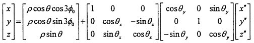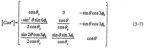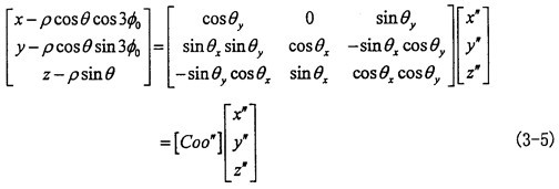 由式(3-6)可知|θy|<θ,|θx|<θ一般來(lái)說(shuō)θ值非常小,則θy和θx則更小。到此方向余弦矩陣[Coo″]的所有項(xiàng)均可求出。其具體的形式如下(為簡(jiǎn)化書(shū)寫(xiě)將θy作為已知參數(shù)代入):