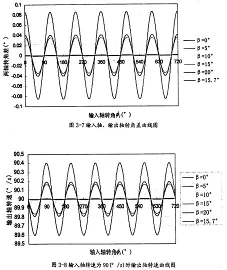 由曲線圖3-7可以看出兩軸的轉(zhuǎn)角差相當(dāng)小,即使在兩軸夾角達(dá)到2oo時(shí),輸入同輸出的最大轉(zhuǎn)角差也不到o.1o,所以在一定的程度上認(rèn)為輸入、輸出轉(zhuǎn)角相同是有一定的道理的。且轉(zhuǎn)角隨兩軸夾角β的增大而增大,變化的頻率為一個(gè)回轉(zhuǎn)周期3次。