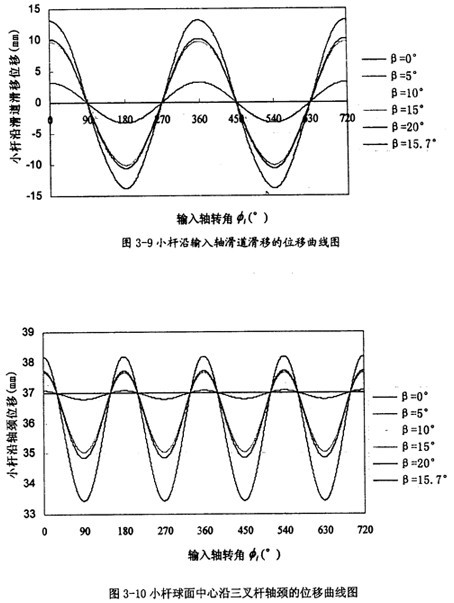 由曲線圖3-9可以看出,小桿沿滑道的位移隨兩軸夾角β的增大而增大,變化量也比較大,變化頻率為一個(gè)回轉(zhuǎn)周期1次。這可以作為三叉桿萬(wàn)向聯(lián)軸器設(shè)計(jì)中,小桿長(zhǎng)度的設(shè)計(jì)依據(jù)。