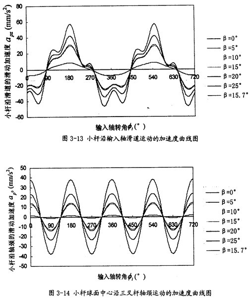 由曲線圖3-13可以看出,小桿沿滑道的運(yùn)動(dòng)加速度其變化較為復(fù)雜,變化具有周期性,變化頻率為一個(gè)回轉(zhuǎn)周期1次。隨兩軸夾角β的增大其最大值增長(zhǎng)較快,它的值可以作為動(dòng)力分析和設(shè)計(jì)計(jì)算的重要依據(jù)。