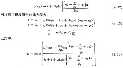 上式中A-1是矩陣A的逆陣,稱誤差矩陣。當算得相應(yīng)的偏導(dǎo)數(shù)值后,如果測得一個齒槽的一側(cè)齒廓與其它齒廓的三條公法線的誤差,代入方程組(4.32)之后,便可求得相應(yīng)的△TZ、△l和△E!鱐Z是經(jīng)計算得到的刀具半徑的誤差,△l是進刀深度誤差,△E是刀具軸線偏心距的誤差,根據(jù)計算結(jié)果適當調(diào)整這些參數(shù)就能迅速地提高齒廓精度,使之達到精度要求。