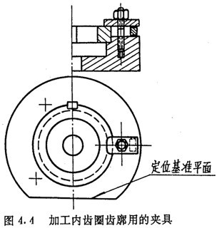內(nèi)齒圈齒廓的數(shù)控加工,是在齒圈外徑及兩端面都精加工后進行的,因此,應(yīng)以端面及外徑作為定位基準。其夾具可做成螺釘壓板結(jié)構(gòu),如圖4.4所示。夾具內(nèi)徑應(yīng)盡量接近齒圈外徑,用千分表以夾具內(nèi)圓為基準找正工作臺軸心。