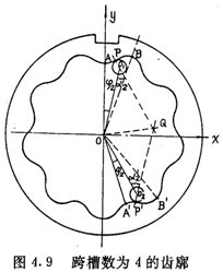 如圖4.9 所示,AB是其中一個齒槽的一側(cè)齒廓,A′B′是跨槽數(shù)為K(圖中k=4)的一個齒梢的另一側(cè)齒廓,它們是兩個性質(zhì)不同的齒廓。若把AB看成是工作齒廓,則A′B′是非工作齒廓。選擇圖4.9所示的坐標系,讓坐標原點O與內(nèi)齒圈幾何中心重合,y軸與OA重合。設(shè)P(x,y)為AB齒廓上的一點,在P點與內(nèi)齒圈齒廓相接觸的外滾子的位置角為