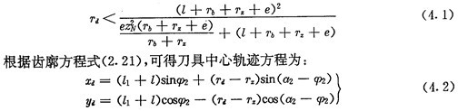 由上面可知,用數(shù)控加工齒廓時,應(yīng)求出圓插刀中心的軌跡,它是被加工內(nèi)齒圈齒廓曲線的內(nèi)法向等距線,如圖4.3所示。圓插刀的半徑可不等于實際推桿減速器中滾子的半徑,只要刀具半徑Td小于內(nèi)齒圈齒廓在齒根部的最小曲率半徑,在加工過程中不會發(fā)生切削干涉即可。對于激波器為偏心圓的推桿減速器,根據(jù)(2. 35)式,可得不發(fā)生切削干涉的條件為: