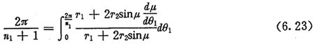 由此可得到結(jié)論:太陽(yáng)輪節(jié)曲線在一個(gè)周期內(nèi)的弧長(zhǎng)與內(nèi)齒圈節(jié)曲線在一個(gè)周期內(nèi)的弧長(zhǎng)相等。若內(nèi)齒圈的周期數(shù)為n2,則n2應(yīng)大于n1。為了減小行星輪尺寸,應(yīng)取最小整數(shù)值n1+1作為內(nèi)齒圈節(jié)曲線的周期數(shù),從而可由(6.9)式得到內(nèi)齒圈節(jié)曲線的封閉條件為: