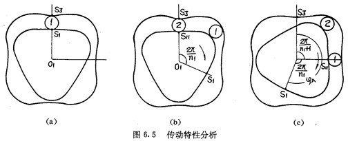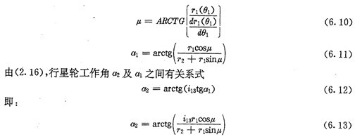 另一方面,由于的比的比值為常數(shù)i13,a2的值已由(6.12)式確定。比較(6.19)式與(6.12)式可知,只有在a1=0且μ= 時(shí),它們才是一致的,由(6.10)式及(6.11)式知,只有在 時(shí)才有μ= ,且a1=0,由于太陽(yáng)輪的節(jié)曲線是周期性,所以在一周內(nèi)只有2n1個(gè)點(diǎn)(nl是太陽(yáng)輪節(jié)曲線的周期數(shù))有 ,其余各點(diǎn) 都不為零,對(duì)于太陽(yáng)輪的轉(zhuǎn)角 只要不是對(duì)應(yīng)于 ,式(6.19)與式(6.12)是矛盾的,也就是說(shuō)M2點(diǎn)必然不會(huì)與M1、O1位于同一直線上。這說(shuō)明當(dāng)傳動(dòng)比為常數(shù)時(shí),行星輪與太陽(yáng)輪、行星輪與內(nèi)齒圈所組成的兩個(gè)嚙合副不可能都作純滾運(yùn)動(dòng),一定有一個(gè)嚙合副有滑動(dòng),因而活齒傳動(dòng)都是滑滾運(yùn)動(dòng)。