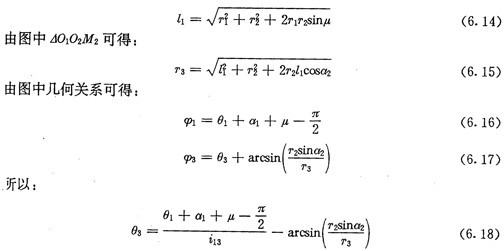 假設(shè)圖6.4中O1、M1、M2三點(diǎn)始終都能保持在同一直線上,則對(duì)于太陽(yáng)輪轉(zhuǎn)角 ,圖6.4中的a2可根據(jù)圖6.3中的行星輪轉(zhuǎn)角θ2求得,由圖中幾何關(guān)系及(6.4)式應(yīng)有