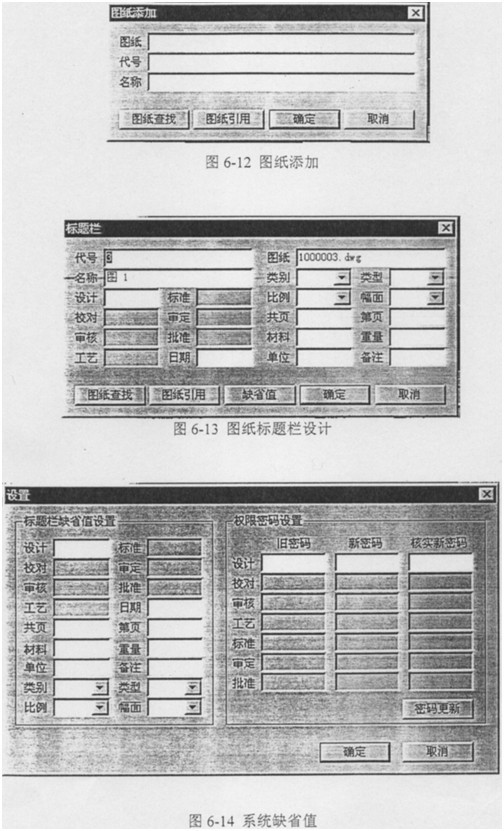 根據(jù)相應(yīng)項(xiàng)的密碼輸入,再選擇/添加/刪除產(chǎn)品,見圖6-10,進(jìn)行圖紙管理系統(tǒng)的主畫面(見圖6-11),進(jìn)而對產(chǎn)品選擇、圖紙進(jìn)行添加、刪除(圖6-12)及其編輯,明細(xì)表、標(biāo)題欄的設(shè)計(圖6-13)以及一些系統(tǒng)缺省值(圖6-14)的固定等等;