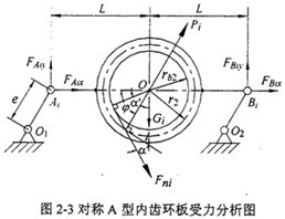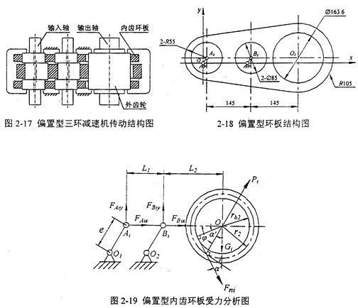 其次分析偏置型三環(huán)減速機(jī)的情況,圖2-17所示為偏置型三環(huán)減速機(jī)傳動結(jié)構(gòu)圖,偏置型三環(huán)減速機(jī)的一塊環(huán)板的結(jié)構(gòu)如圖2-18所示,它的受力情況和坐標(biāo)系選取如圖2-19所示,符號的標(biāo)定及含義同對稱型三環(huán)減速機(jī)。