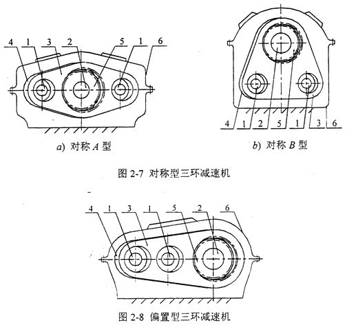 偏置型三環(huán)減速機(jī)的環(huán)板軸承所受載荷比對稱型三環(huán)減速機(jī)大很多,在設(shè)計和實(shí)際使用中應(yīng)盡量避免采用這種結(jié)構(gòu)布置形式。雖然對稱B型和偏置型三環(huán)減速機(jī)的受力性能不如對稱A型三環(huán)減速機(jī),但是由于它們的兩個輸入軸比較接近,故而易于實(shí)現(xiàn)雙驅(qū)動。