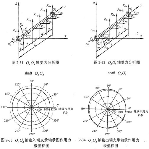 由2.3.3分析可知:當(dāng)求得環(huán)板上的軸承作用力FAix、FAiy,F(xiàn)Bix、FBiy后,通過輸入軸和支承軸的受力分析,不難求得箱體上各軸承的作用力。兩根一級輸出二級輸入軸的受力分析如圖2-31、2-32所示。