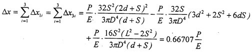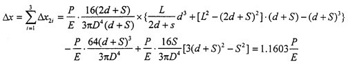 上式方程數(shù)為9個,而方程中未知量的總數(shù)為12個,故存在3個多余未知量。根據(jù)前述的變形協(xié)調(diào)條件,建立3個變形協(xié)調(diào)方程,作為機(jī)械受力分析的補(bǔ)充方程,利用高期消元法即可求解。