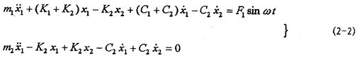 對(duì)應(yīng)的力學(xué)模型如圖2-3(見(jiàn)22頁(yè))所示,式中m1為振動(dòng)臺(tái)動(dòng)圈、聯(lián)軸器外套及固定在振動(dòng)臺(tái)上夾具的質(zhì)量;m2為聯(lián)軸器內(nèi)套、芯軸及配重的質(zhì)量;K1為振動(dòng)臺(tái)支撐動(dòng)圈部分的剛度系數(shù),K2為聯(lián)軸器彈性元件的剛度系數(shù);C1為振動(dòng)臺(tái)動(dòng)圈阻尼系數(shù);C2為聯(lián)軸器