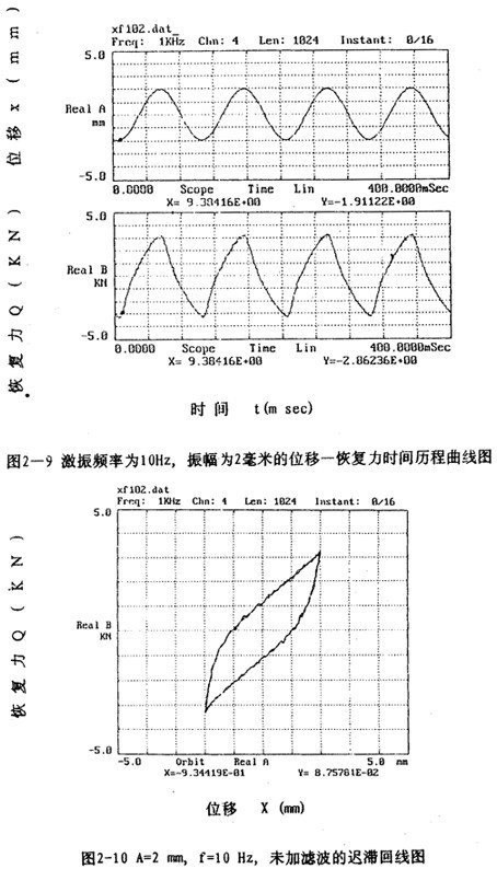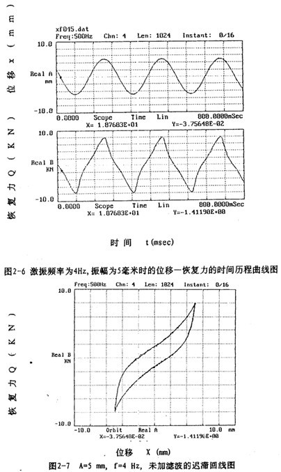 信號(hào)處理時(shí),將磁帶記錄儀記錄的五路振動(dòng)信號(hào)經(jīng)磁帶記錄儀回放,愉出到數(shù)據(jù)采集板(A/D板)進(jìn)行五路振動(dòng)信號(hào)(恢復(fù)力、位移、速度、加速度信號(hào))同步采樣和A/D轉(zhuǎn)換,然后輸出到PC386微機(jī)存人磁盤(pán),該數(shù)據(jù)采集系統(tǒng)采集的數(shù)據(jù)都是以二進(jìn)制形式存儲(chǔ)的文件。為了計(jì)算和閱讀方便,需將二進(jìn)制數(shù)據(jù)文件轉(zhuǎn)換成ASC碼文件,然后再編程進(jìn)行數(shù)據(jù)處理.對(duì)處理后形成的數(shù)據(jù)文件進(jìn)行作圖可以形成許多相應(yīng)的曲線圖,圖2-6至圖2-13是眾多曲線中的一部分。