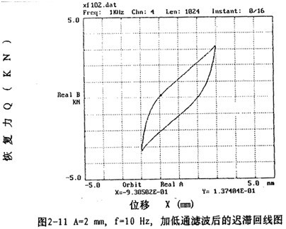 圖2-6表示激振頻率為4Hz,振動(dòng)位移幅值為±5毫米的位移和恢復(fù)力的時(shí)間歷程曲線圖,由圖可知,位移時(shí)間歷程為正弦波形,對(duì)應(yīng)的恢復(fù)力時(shí)間歷程為近似的鋸齒波形。以位移為橫坐標(biāo),恢復(fù)力為縱坐標(biāo),圖2-6對(duì)應(yīng)的位移恢復(fù)力圖為圖2-7,由此圖可知彈性聯(lián)軸器具有非線性遲滯特性。在動(dòng)態(tài)情況下,由于機(jī)座的高頻振動(dòng)和環(huán)境干擾等因素,試驗(yàn)記錄的信號(hào)中有高頻成分存在,這使得遲滯回線不光滑,加低通數(shù)字濾波后可得光滑的遲滯回線,如圖2-8所示。