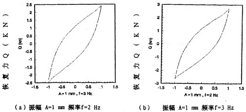 圖2-13(見(jiàn)28、29頁(yè))表示振幅為l毫米,激振頻率分別為2,3,4,6,8,10Hz的遲滯回線圖,圖2-15(見(jiàn)29頁(yè))表示振幅為1毫米,激振頻率為1,2,3,4,6,8,10,20,30Hz的遲滯回線合圖。由圖2-15可知,彈性聯(lián)軸器的動(dòng)剛度與振動(dòng)頻率有關(guān),即隨著頻率增大,對(duì)應(yīng)的遲滯回線的恢復(fù)力與位移的比值變小,當(dāng)頻率在8Hz至30Hz范圍內(nèi)時(shí),遲滯回線基本重合,由此可知鋼絲繩聯(lián)軸器動(dòng)剛度在一定頻率范圍內(nèi)與頻率有關(guān)、當(dāng)頻率增大到8Hz以后,聯(lián)軸器的動(dòng)剛度不再隨頻率變化而變化,因而聯(lián)軸器的動(dòng)剛度在一定頻率范圍內(nèi)是頻率的非線性函數(shù),當(dāng)頻率增大到一定值后,動(dòng)剛度與頻率無(wú)關(guān)。同樣,聯(lián)軸器的阻尼在一定頻率范圍內(nèi)是頻率的非線性函數(shù),當(dāng)頻率增大到一定值后(這里是8Hz),阻尼與頻率無(wú)關(guān)。