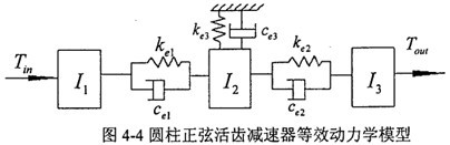 根據(jù)上面敘述的方法,可以建立起如圖4-3所示的動(dòng)力學(xué)模型。為便于分析,將圓柱正弦活齒傳動(dòng)系統(tǒng)的動(dòng)力學(xué)模型簡(jiǎn)化,由于在一個(gè)工作周期中,各活齒在扭振方向的工作狀態(tài)完全相同,故可將所有的活齒等效為一個(gè)慣性元件,并根據(jù)熱能不變的原則,將各活齒副的嚙合剛度轉(zhuǎn)化為等效的扭轉(zhuǎn)剛度,然后疊加得出整體的等效扭轉(zhuǎn)剛度。由此,各活齒與主動(dòng)軸、導(dǎo)架及殼體間并聯(lián)的彈性連接和阻尼分別等效為一個(gè)彈性軸段。等效簡(jiǎn)化后的動(dòng)力學(xué)模型如圖4-4所示。